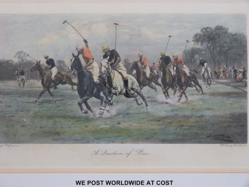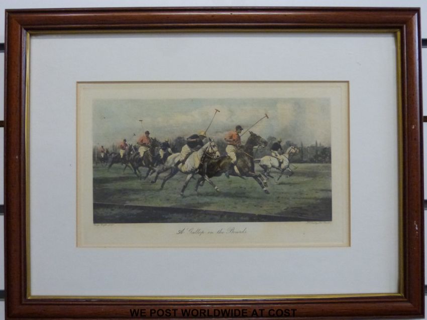 Two pairs of framed polo prints, larger pair 34 x 44cm, together with a Roy Perry signed limited edition (365 / 500) print 'Village Cricket'