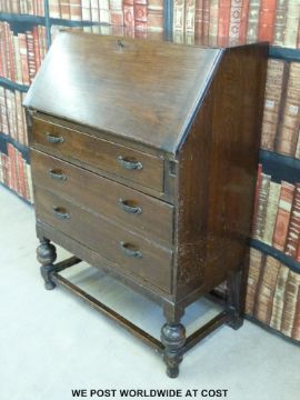 An oak bureau with three drawers below (W74 x D41 x H100cm)