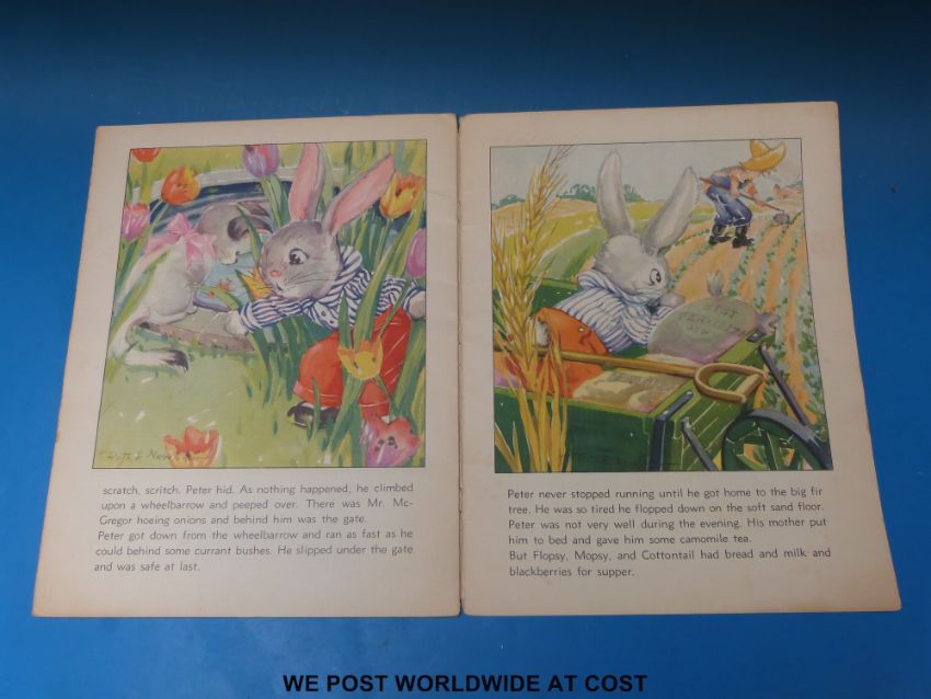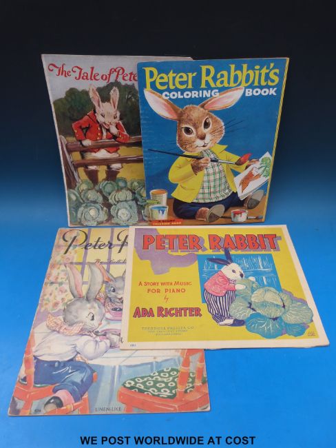 Beatrix Potter, various Peter Rabbit books (1928 - 1938) the story book, piano music book (1946) plus a colouring book and 1950's pop-up book together with a Horgan Milling cloth flour sack with Peter Rabbit cut-out figure from the 1940s