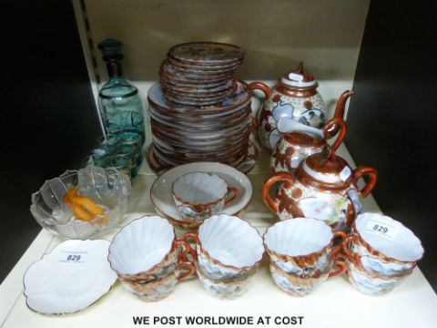 A Japanese eggshell porcelain tea set, Art Deco napkin ring, saki set etc