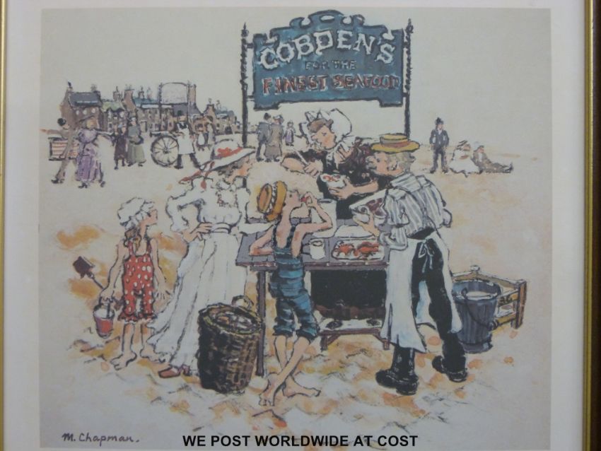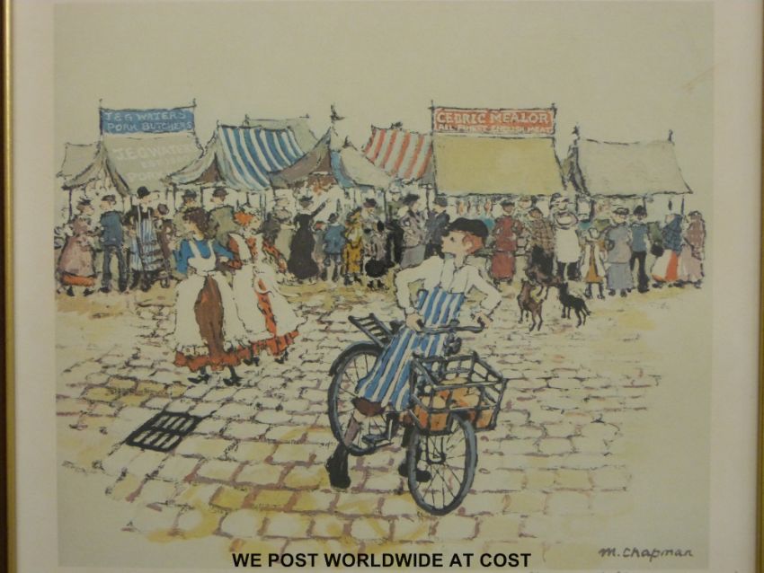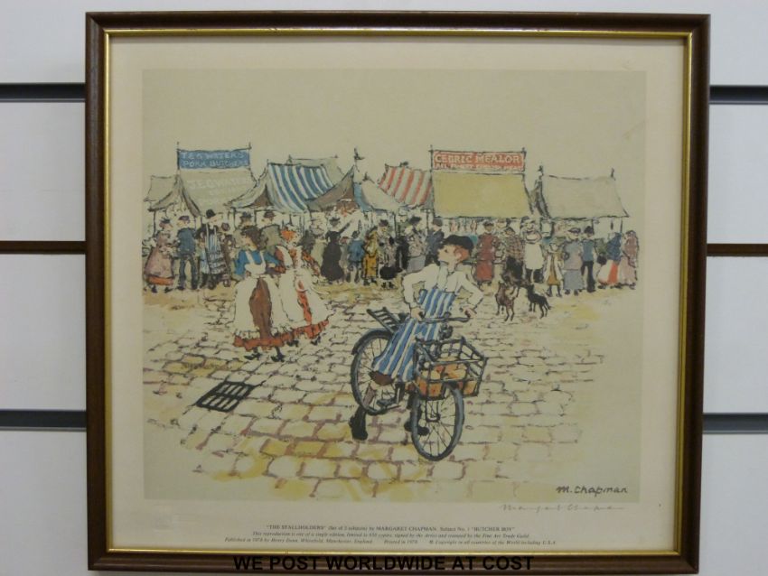 Margaret Chapman set of three signed prints "The Stallholders", each 30x33cm together with a book by the artist