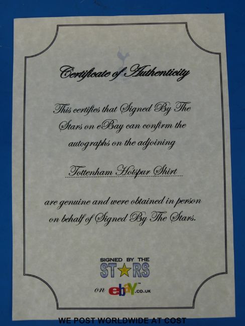 Autographed Tottenham Hotspur football club shirt signed by Gareth Bale, Robbie Keane, Ledley King, Jermaine Jenas, Johnothan Woodgate, Dimitar Berbatov, Michael Dawson, Darren Bent, Didier Zakora, Aaron Lennon, Tom Huddlestone and Steed Malbranque, with certificate of authenticity, framed and glazed.