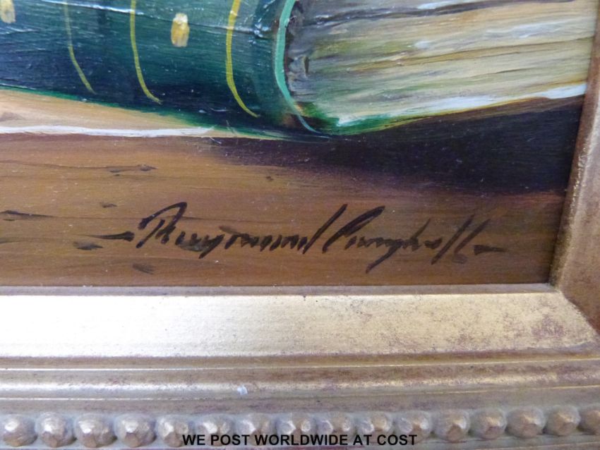 Raymond Campbell (20thC) oil on board, still life of wine, cheese, grapes and a basket (39 x 59cm)