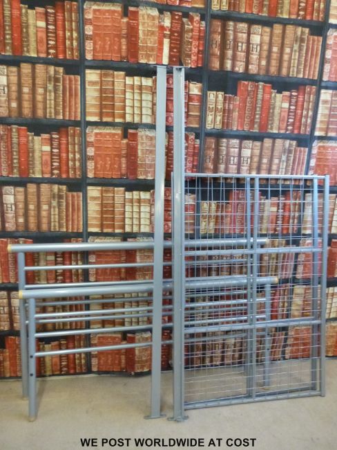 A contemporary steel tubular framed double bed in aluminium finish with pine end stops