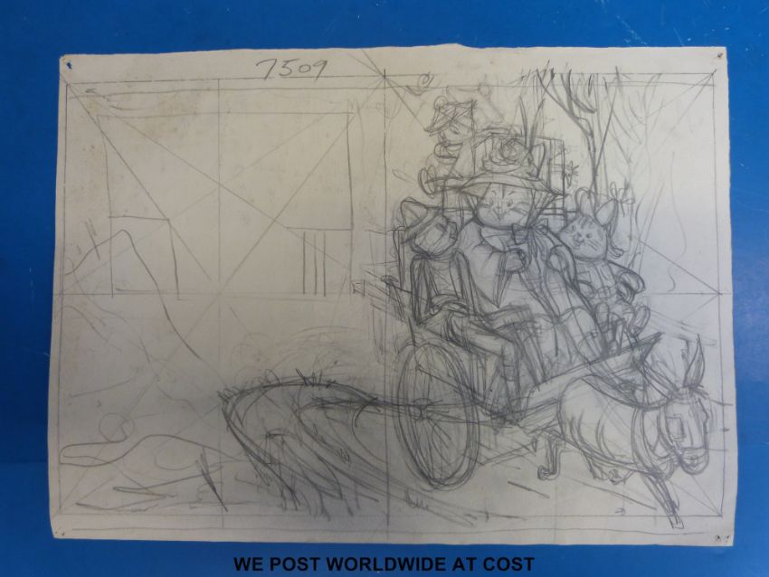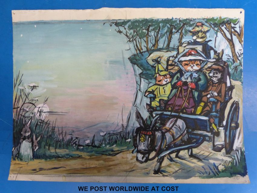 CAM (Barbara Mary Campbell) original watercolour art work of cats on a donkey cart, originally for a children's book (25 x 38cm)