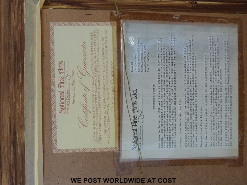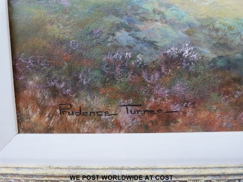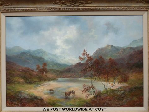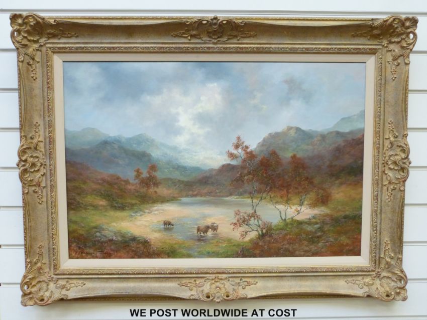 Prudence Turner (b1930) Oil on canvas cattle watering in a highland river valley (49 x 74cm)
