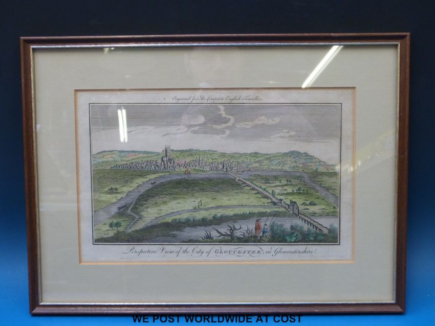 A coloured engraving, 'Perspective view of the City of Gloucester, in Gloucestershire', (16 x 28 cm)