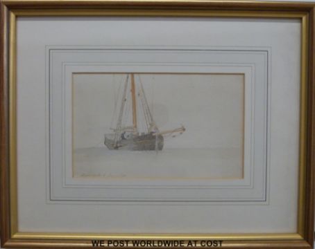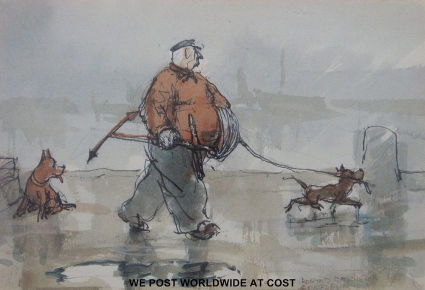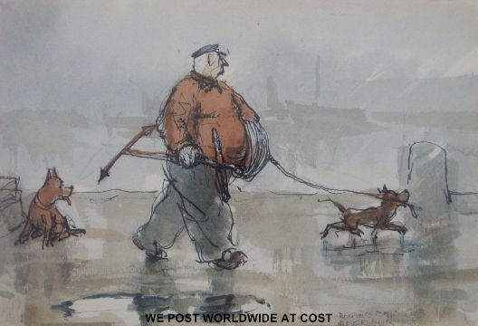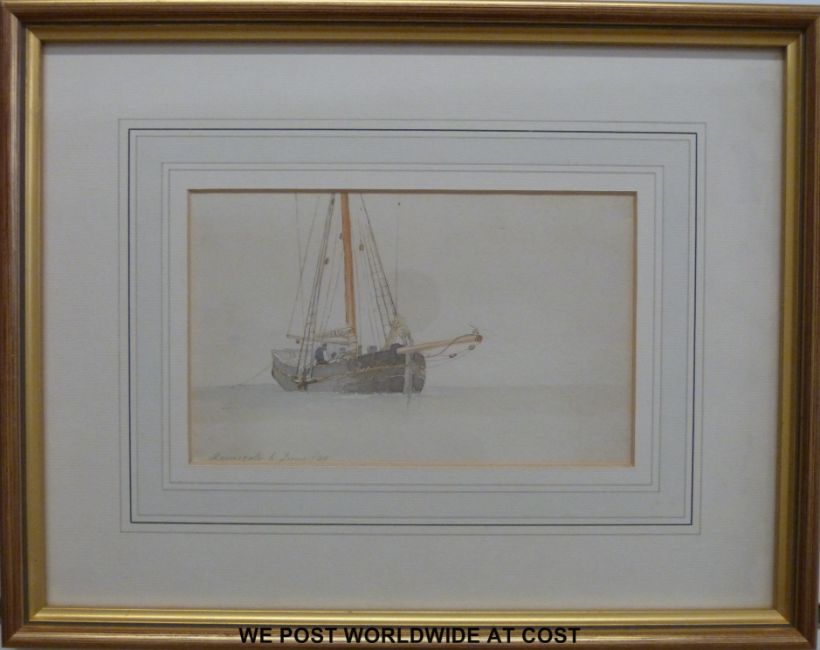 John Christian Schetky (1778-1874) unsigned watercolour "Ramsgate 6 June 1849" (23cm x 21cm) together with a watercolour of a pony and trap (15cm x 21cm) and a limited edition (13/350) print of a man walking dogs at Barfleur, signed Roland Bacheler (13.5cm x 20cm)