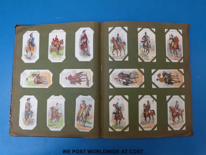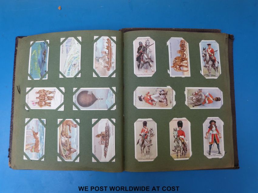Five early 20th century cigarette card albums; three containing cards of mixed subjects including ships, soldiers, cars, tennis etc, two empty