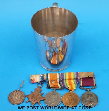 A set of four WWI medals comprising Aug-Nov 1914 star and George V Long Service Medal stamped 81096 B.Q.M. Sgt W.A Grudgings R.F.A and 1914-1918 and Great War medals stamped 81096, B.Q.M..Sgt W.A Grudgings R.A., together with a George V 1935 medal and a pint tankard engraved F.A.R