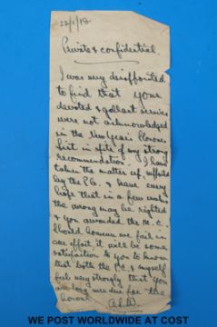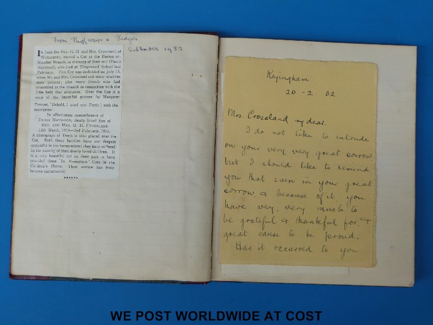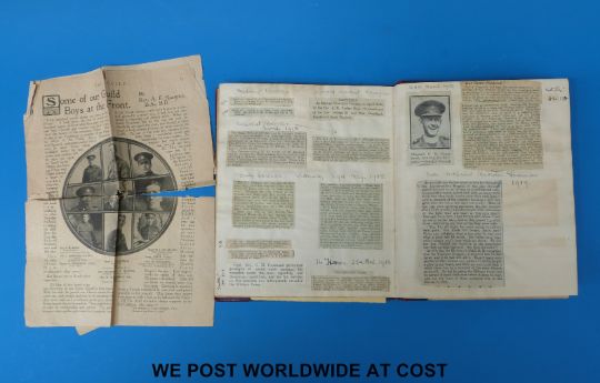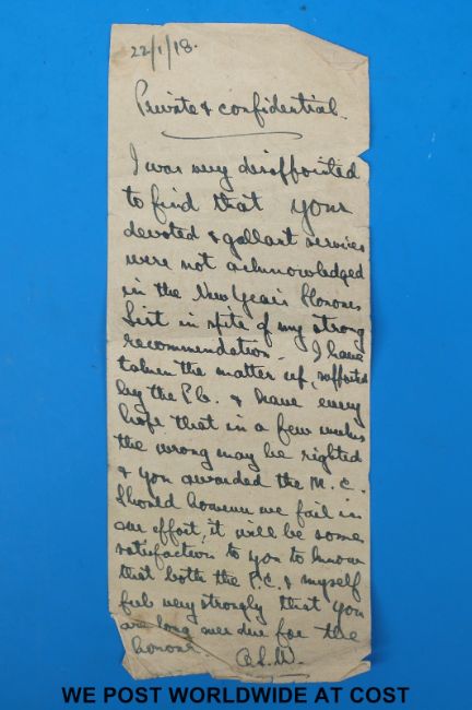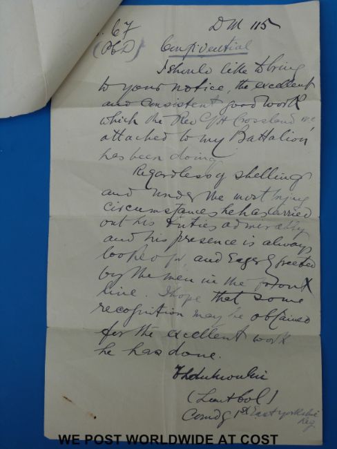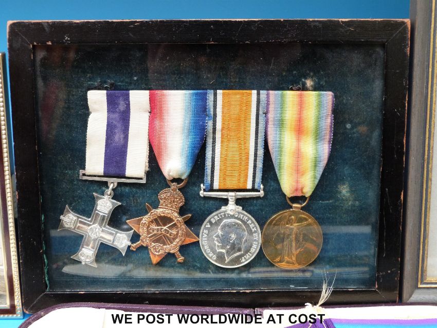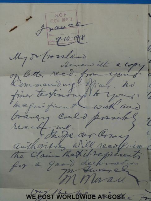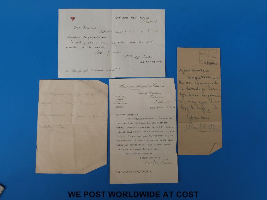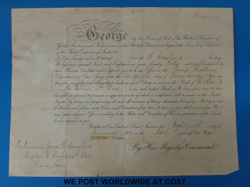 A WWI Military Cross medal group awarded to Reverend G.H. Crossland, comprising military cross engraved verso "Presented to Rev. G.H.Crossland by H.M. King George V at Buckingham Palace 23rd March 1918", 1914-15 star engraved Rev. G.H.Crossland A.C.D and 1914-18 and Great War medals marked Rev.G.H.Crossland, together with dog tag reading G.H.Crossland 64 Inf Bde WES Chap with attached fob with hair and photograph of a lady and chaplain's lapel badge. Also included is a quantity of relevant ephemera comprising commission dated 1915, photograph of the recipient, various other military postcards and photographs, letters of congratulations on the award, a notebook with cuttings and notes on family history including his post war work. One cutting cites him as doing "useful work amongst the wounded under the most appalling and dangerous conditions" and as such being awarded the military cross and another cutting giving his personal memories of the nature of his war work.