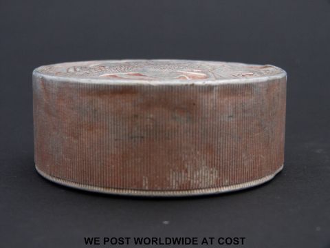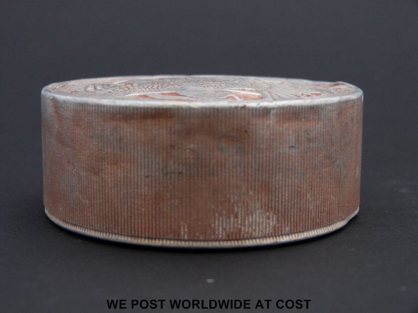 Lalique Fleur D'amour aluminium powder box c1910 designed by R. Lalique for Roger Et Gallet of Paris decorated with birds of paradise on lid and sepia staining, signed Lalique (8cm in diameter)