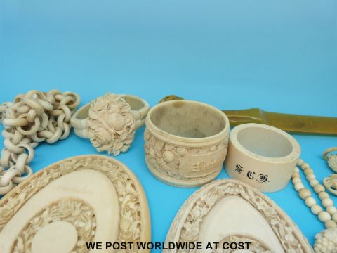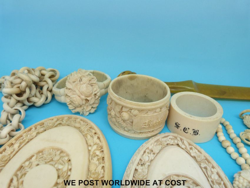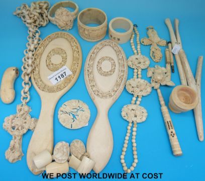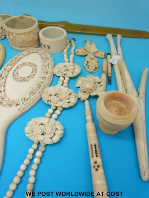 A large collection of European carved ivory and bone including a deeply carved crucifix decorated in roses on ivory chain, two bracelets, a carved napkin ring, two carved ivory hand mirrors etc