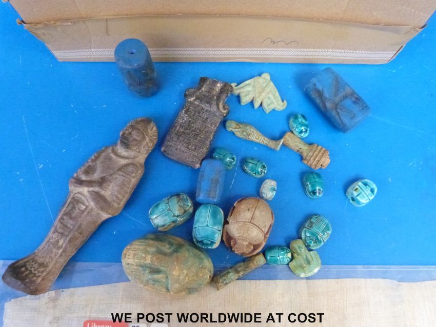 A collection of Egyptian and similar style items to include scarab beetle, bronze frog, early glass fragments, hardstone items etc.