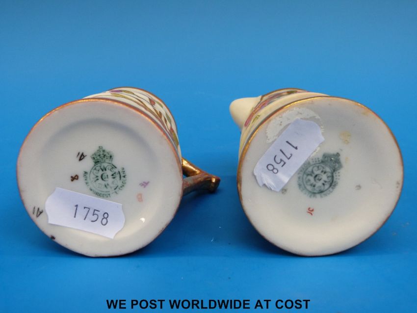 Two c1900 Royal Worcester barrel shaped jugs hand painted with flowers (6cm tall)