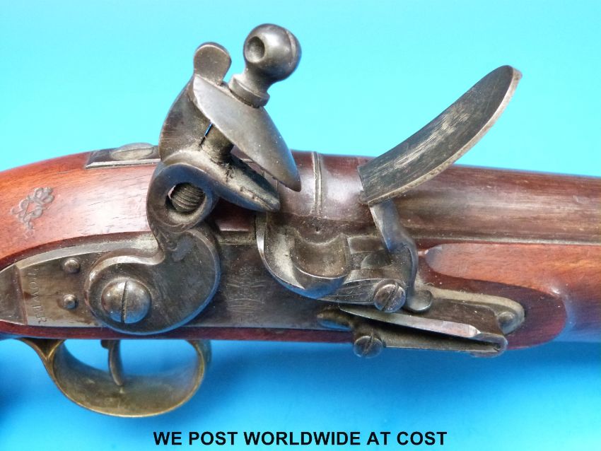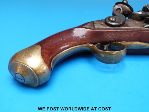 A hammer action flintlock new land pattern pistol with lock stamped Tower and crown topped GR cypher, brass mounts, captive ramrod, multiple cyphers and proof marks to grip and 8.75" barrel also stamped with multiple proof marks and retaining much of its original browning, c1780, overall length 40cm