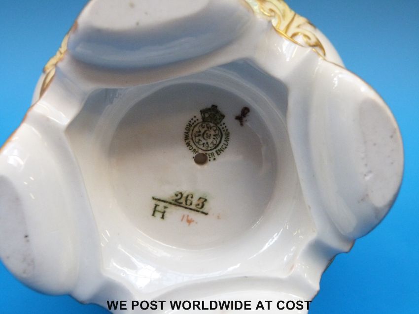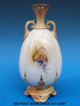 A late 19thC Royal Worcester pedestal vase, hand-decorated with a robin among rosehips and a berry cartouche verso, signed Barker. Green printed Worcester stamp to base, shape no H263 (19cm tall)