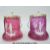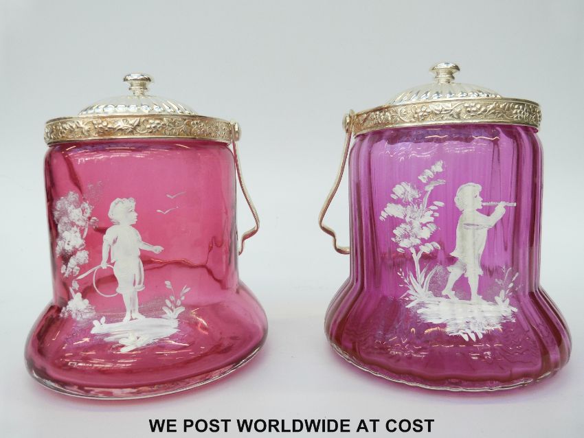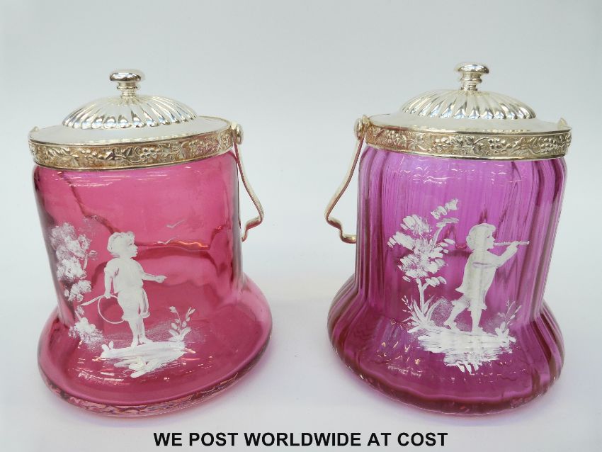 A pair of Mary Gregory cranberry glass biscuit barrels with silver plated rims and handles and enamelled decoration (18cm tall)