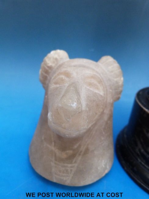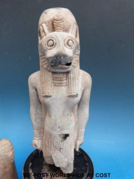Two Egyptian antiquities, one of Sekhmet, the other the lid of a funerary jar in the form of a lion god
