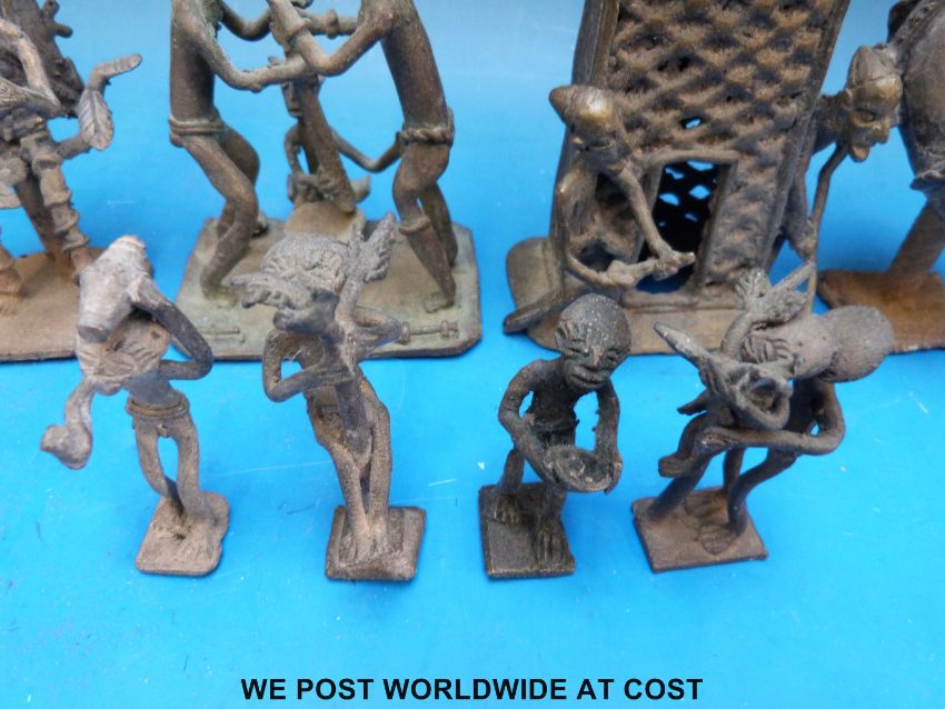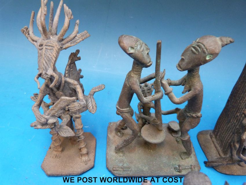 An African Ashanti bronze figural face on stand, four bronze African Ashanti tribe figures/ gold weights, two Ashanti bronze figural bronze groups/ gold weights and an African Ashanti bronze in the form of a house with two figures