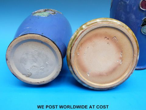 A pair of Royal Doulton vases decorated with fruit on a blue ground, stamped S709 to the base (24cm tall) together with a Doulton Lambeth dish stamped 8233 MH to the base (diameter 12cm)