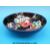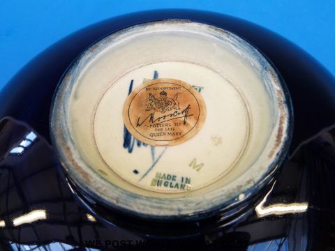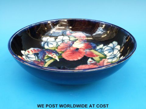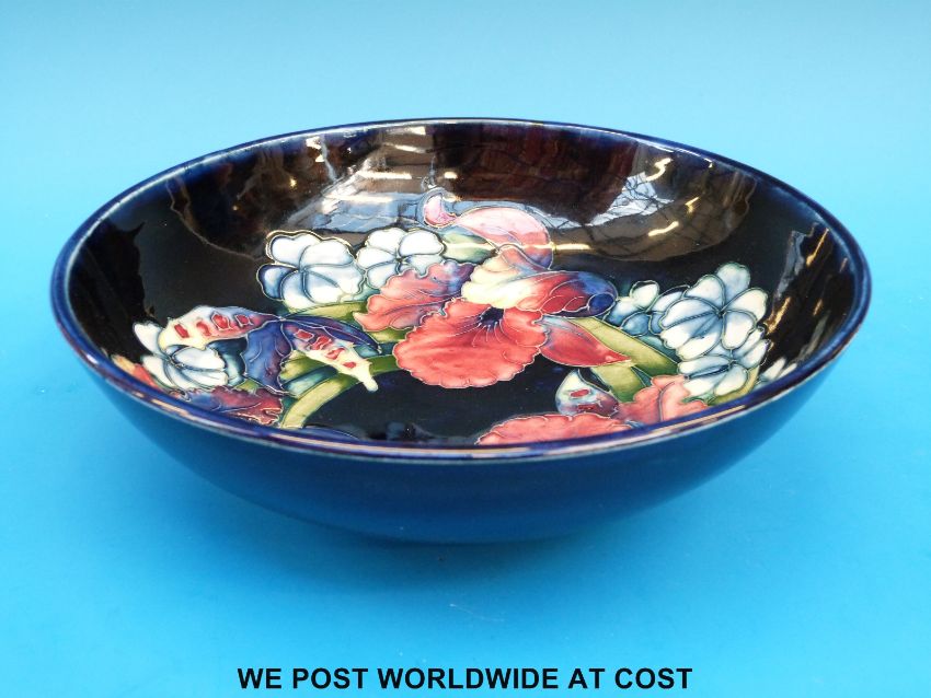 A Moorcroft footed bowl decorated in Iris pattern on blue ground, with label "By appointment Potters to the late Queen Mary" (7.5cm tall, 21cm diameter)