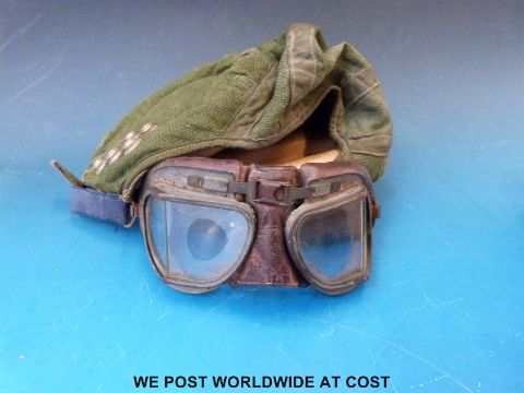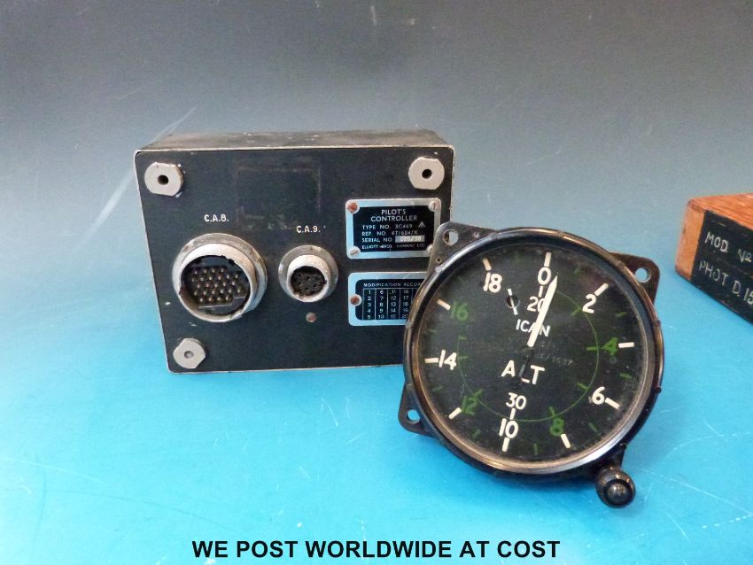 A quantity of aircraft parts etc to include military altitude gauge, pilot's controller 3C469 cased kilowatt meter, recorder case, flying helmet and goggles