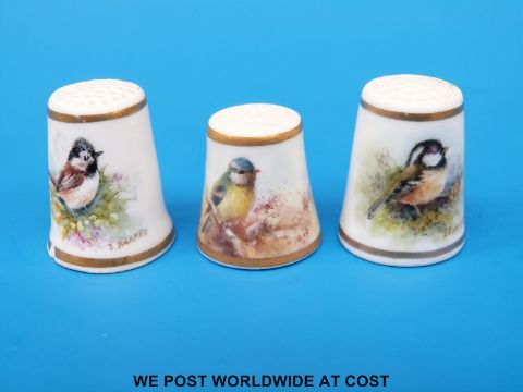 Three Royal Worcester thimbles hand decorated with birds, two signed Barber, the other Stinton, all with puce marks (tallest 2.5cm)