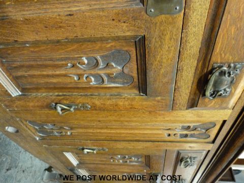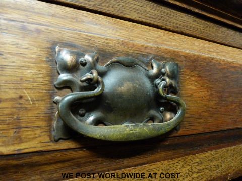 An Arts & Crafts / Art Nouveau sideboard fitted two drawers and two cupboards with beaten copper hinges and handles (W153 x D55 x H106cm)