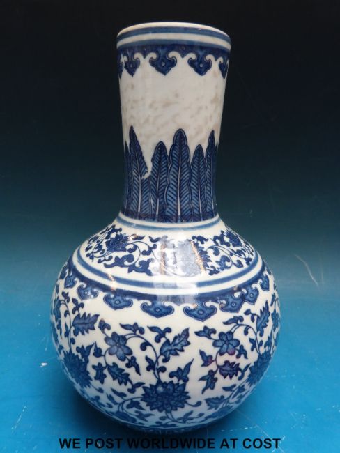 A Chinese Kangxi style blue and white bottle vase with seal mark to base (20.5cm tall)