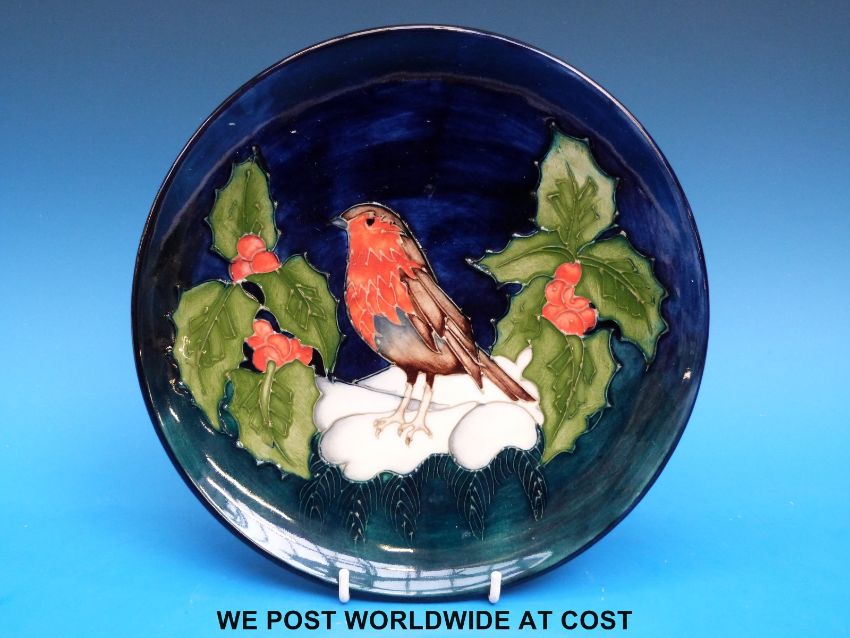 A Moorcroft Christmas plate featuring a robin surrounded by holly (22cm wide)
