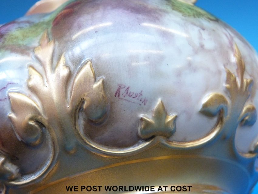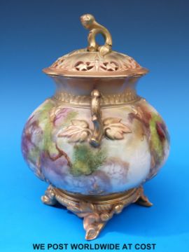 A Royal Worcester pot pourri hand decorated with peacocks in a pine tree signed R. Austin, green printed Worcester mark, shape no. H241 (20cm tall)
