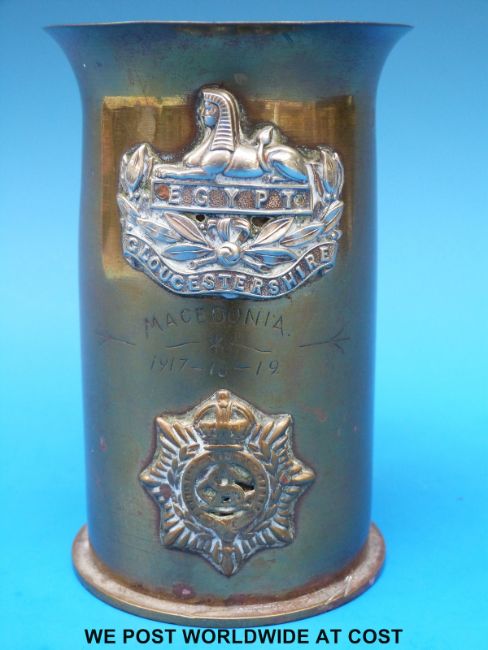 A Gloucestershire Regiment trench art vase with Macedonia 1917-18-19 to front (13.5cm tall)