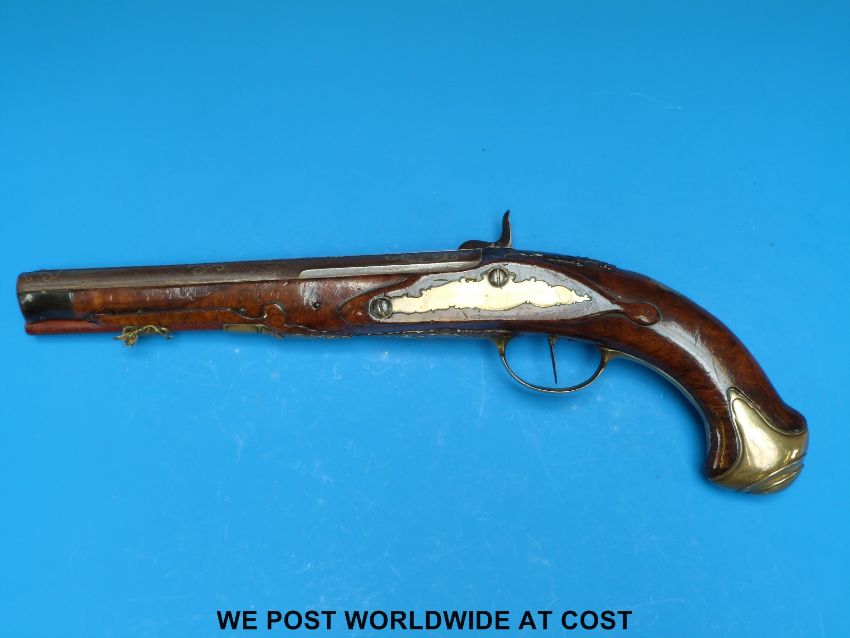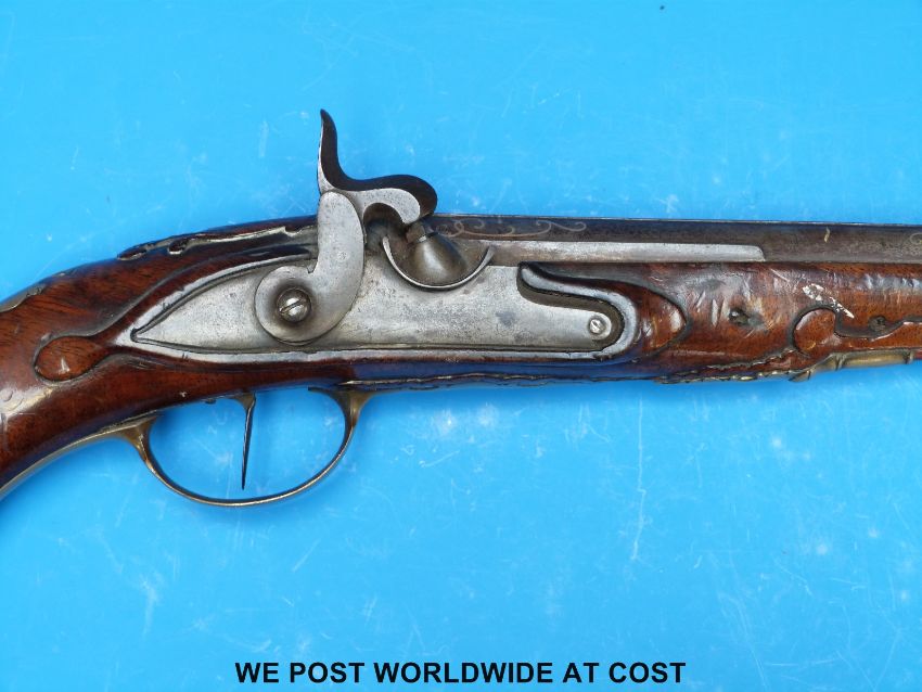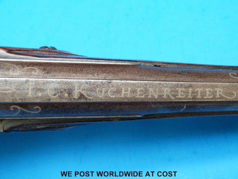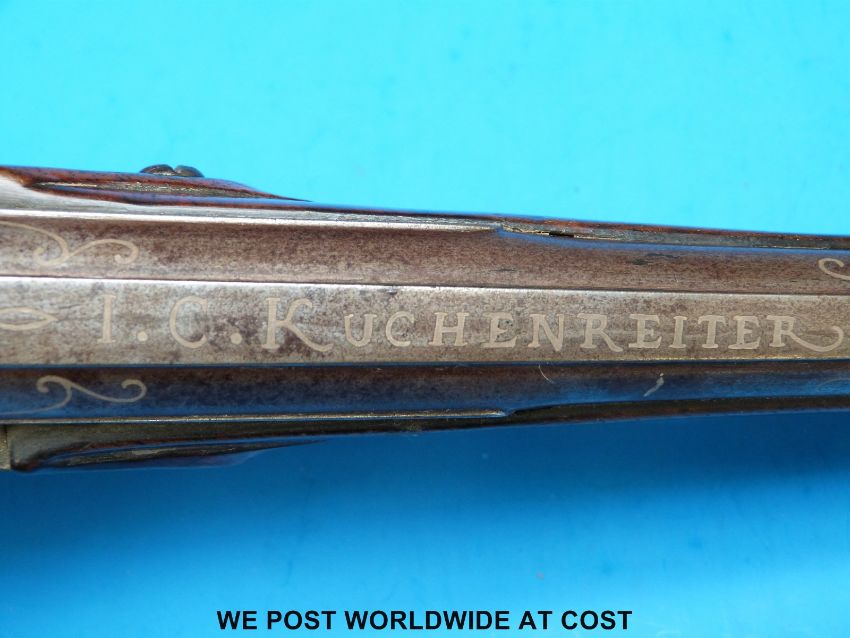 An I C Kuchenzeiter hammer action percussion connected from flintlock with set trigger, brass mounts, carved grip and inlaid and named 8.75" barrel, c1800, overall length 39cm