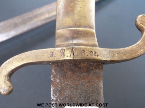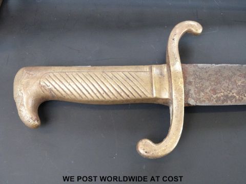 A brass-handled carved sword and a brass-handled bayonet