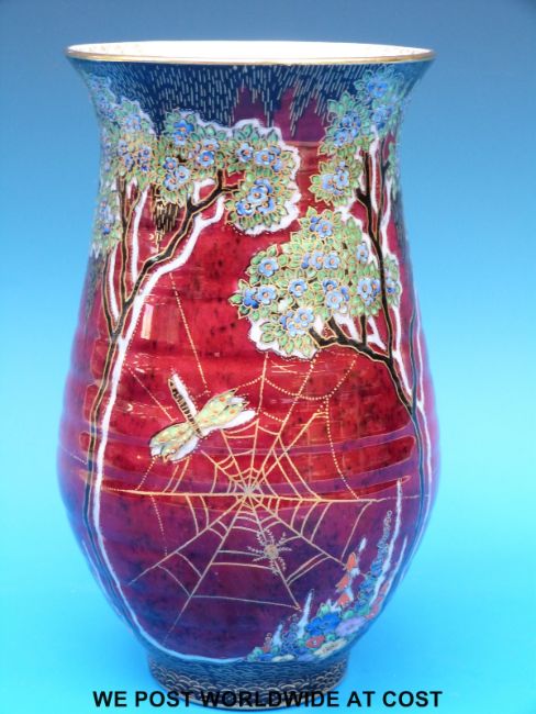 A Crown Devon lustre vase decorated with flowers, trees and a spider's web (23cm tall)