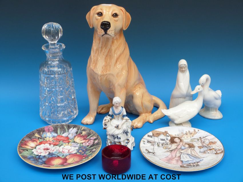 A Beswick fireside golden retriever together with two Nao geese, Royal Worcester collector's plates, cut glass decanter etc