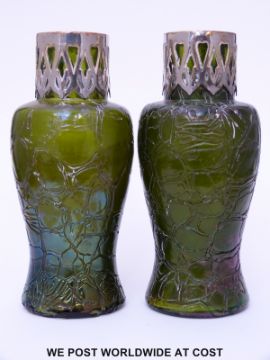 A pair of Kralik crackle iridescent glass vases of waisted form with pierced chrome metal mounts (15cm tall)