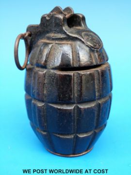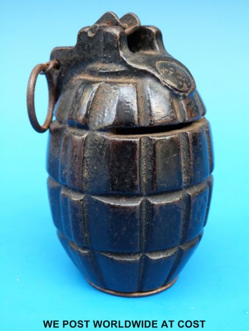 A Mills hand grenade formed into a money box, marked to front with letter F, believed to be a period piece sold to the public as a novelty, made using rejected parts