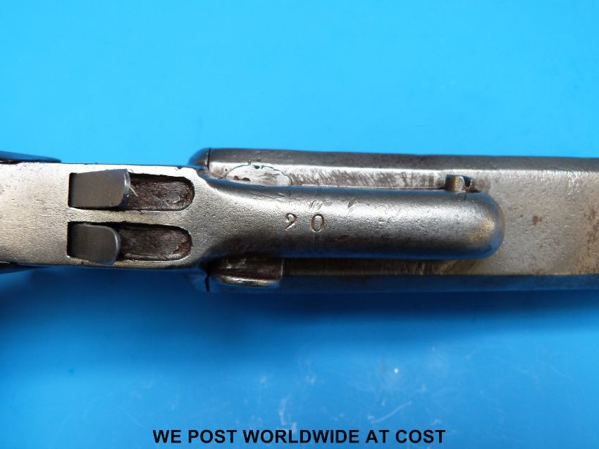 A hammer action pin fire percussion pistol with reeded grips and locks, folding triggers and numbered 20, overall length 23.5cm