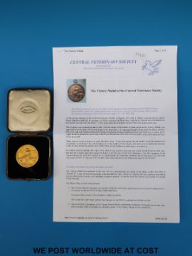 A cased 9ct gold Central Veterinary Society London 1914 - 1918 Victory medal awarded to H.D. Jones 1935. The medal was designed in 1920 and awarded to the person who, in the opinion of the council, had done most to further the interests of the society during that year (weight 28.5g)