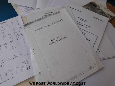 A quantity of photocopied Preston, Blackpool etc signal box diagrams, a pencil Salisbury to Surbiton track plan, Network Rail signalling notices including track diagrams, further original track diagrams including Preston etc., Clapham Junction and other London suburbs, Farnborough etc.