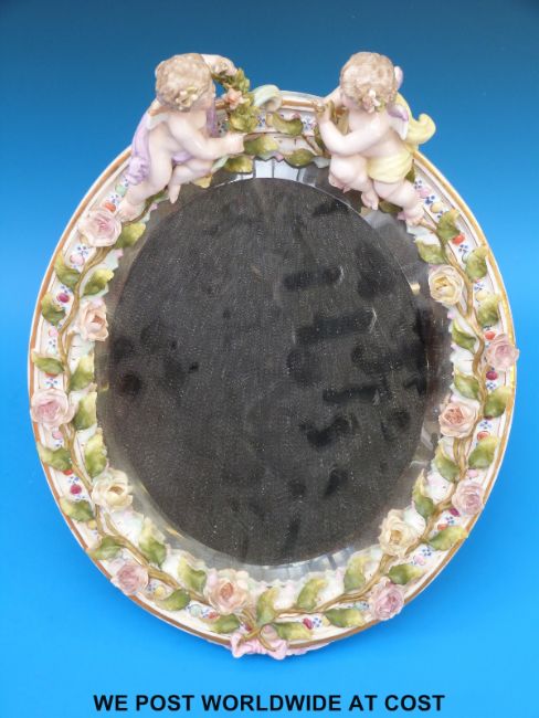 A German figural oval mirror with applied flower decoration and with easel back, probably Volkstedt