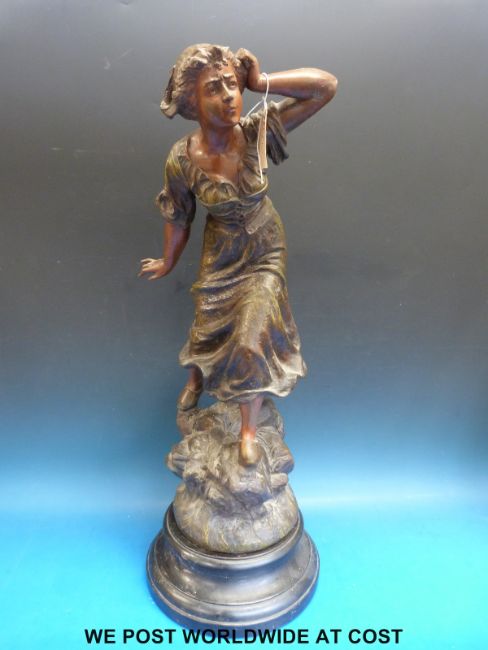 An early 20thC spelter figure of a Dutch girl on turned base (height 66cm)
