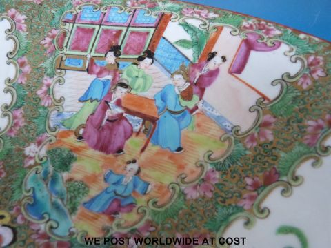 A large Chinese famille rose charger with six sections depicting figural, floral and insect scenes (40cm diameter)