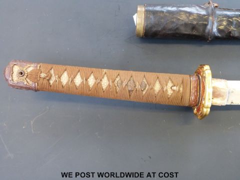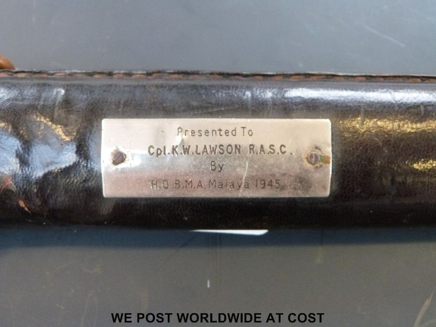 A Japanese WWII Katana or Samurai sword with presentation plaque to scabbard 'Presented to CPL K.W Lawson RASC by HQBMA Malaya 1945'