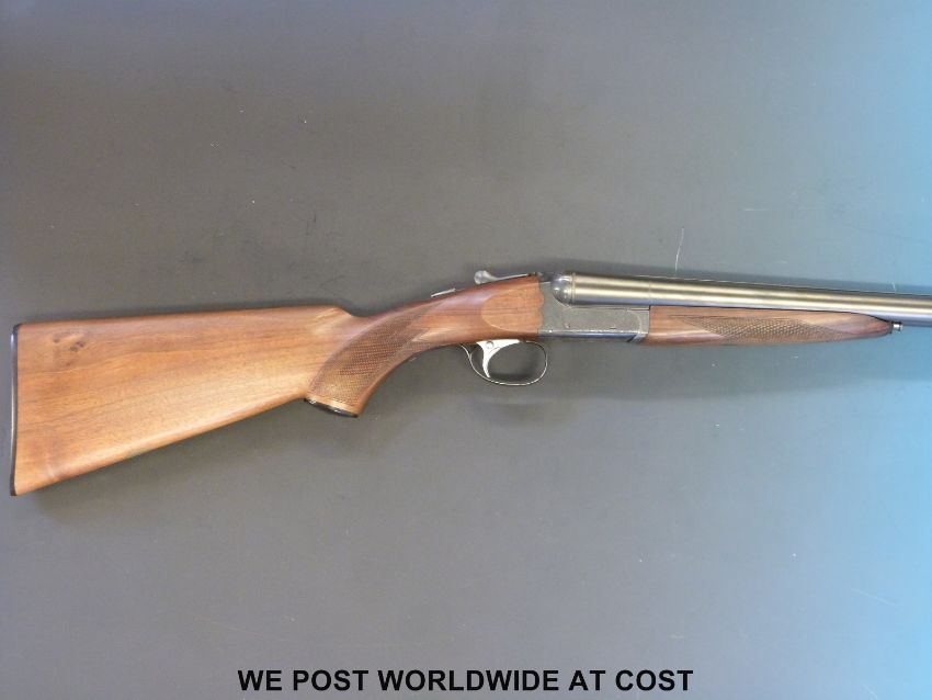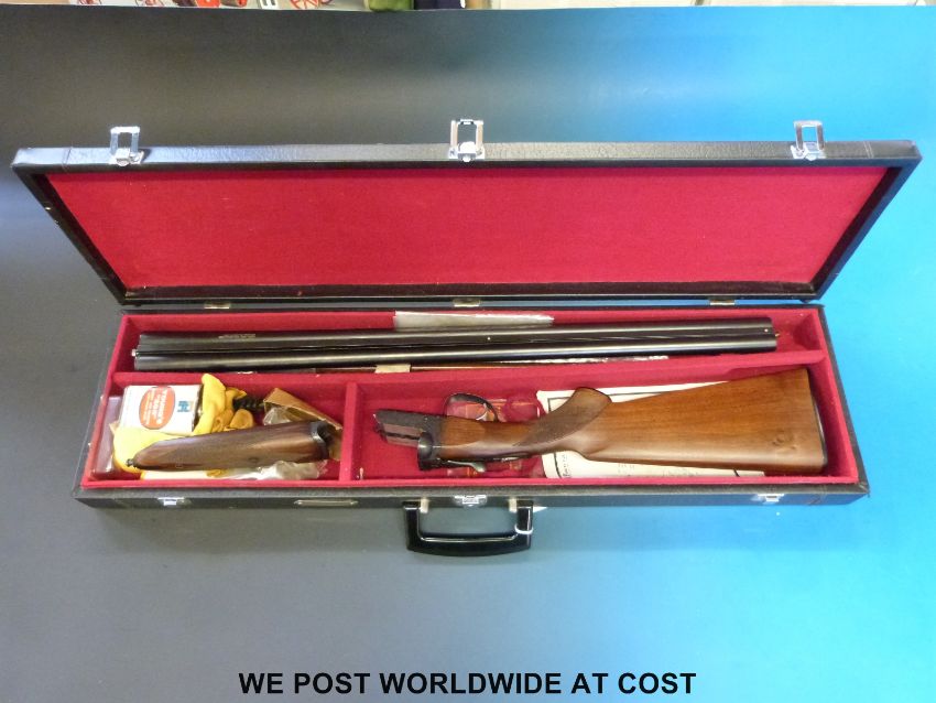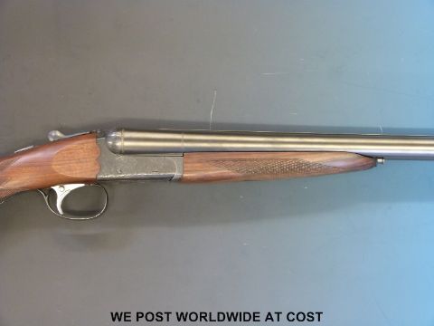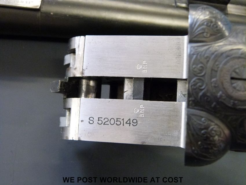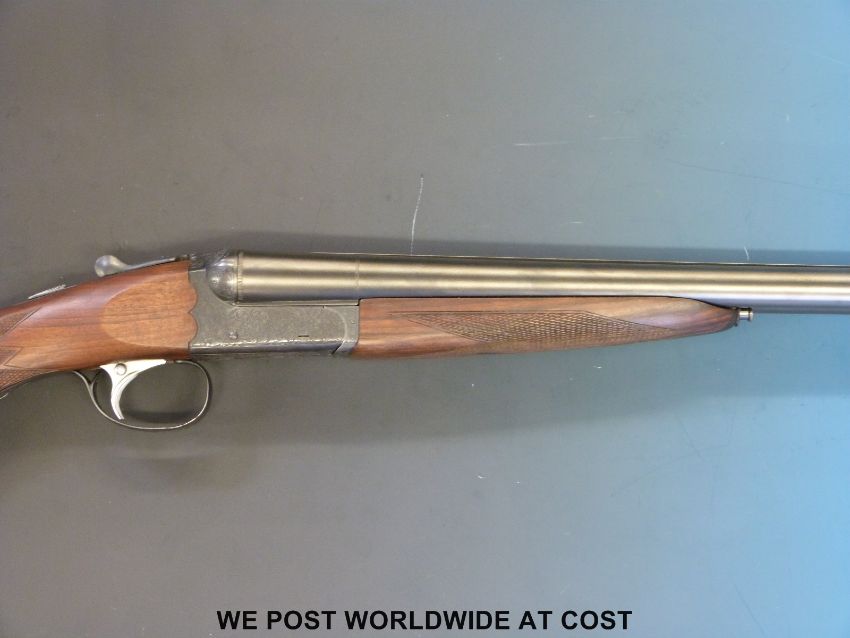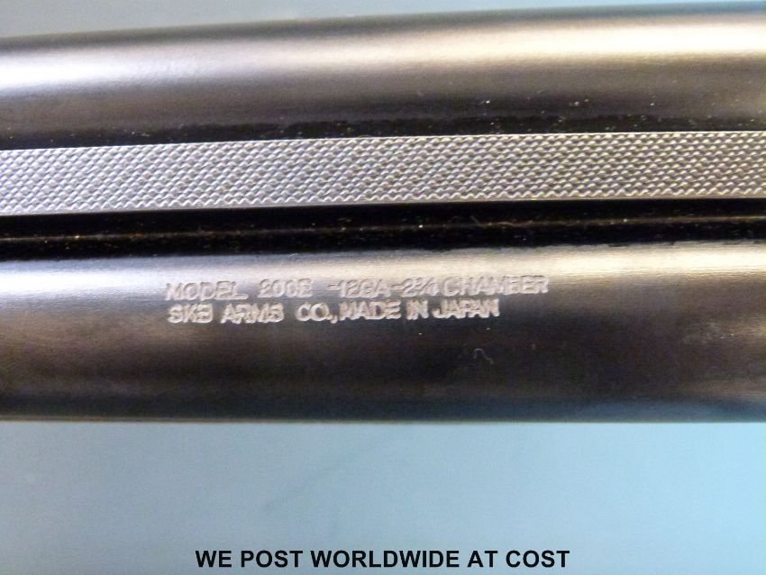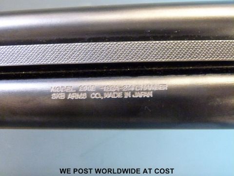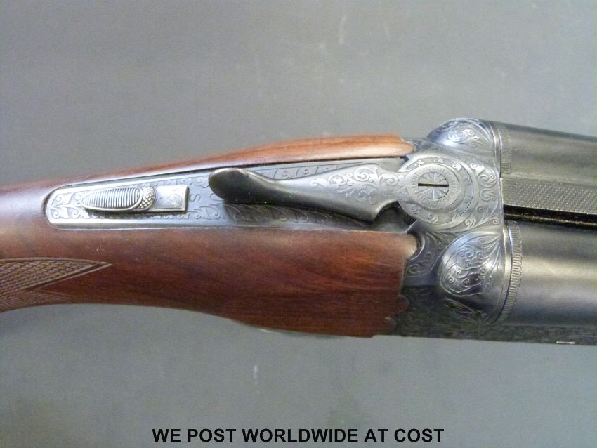 SKB 12 bore double barrelled side by side shotgun with ornate engraving to the locks and chequered semi-pistol grip, in hard fitted case with related paperwork. PLEASE NOTE THAT A VALID RELEVANT FIREARMS/SHOTGUN CERTIFICATE IS REQUIRED TO HANDLE/PURCHASE THIS ITEM.