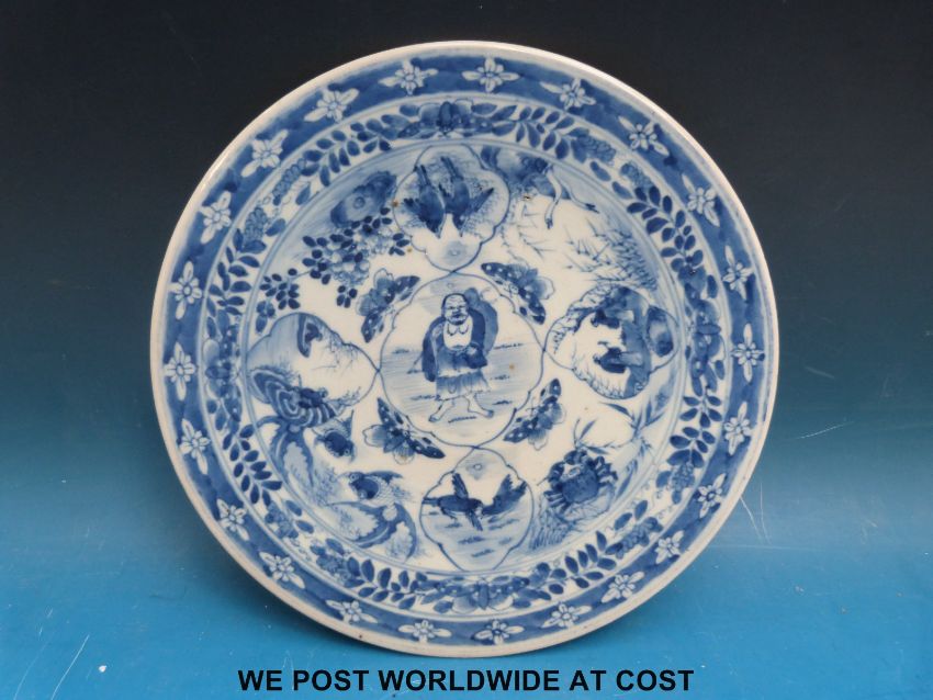 A 19th/20thC Chinese blue and white charger depicting birds, flowers, figures etc (28cm in diameter)
