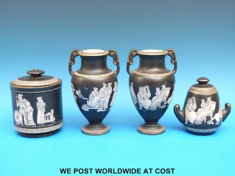 Four Prattware or Pratt of Fenton 'Old Greek' pattern vases, tobacco jar etc (tallest 16.5cm)