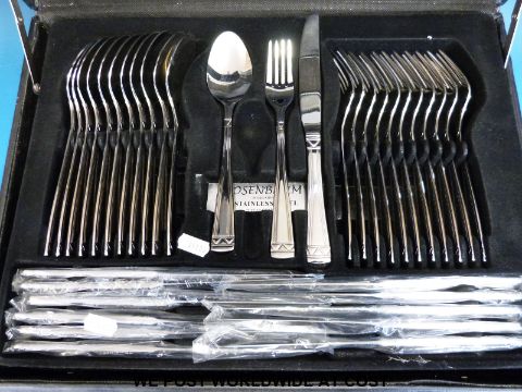 A cased Rosenbaum stainless steel cutlery set, together with five graduated French copper pans